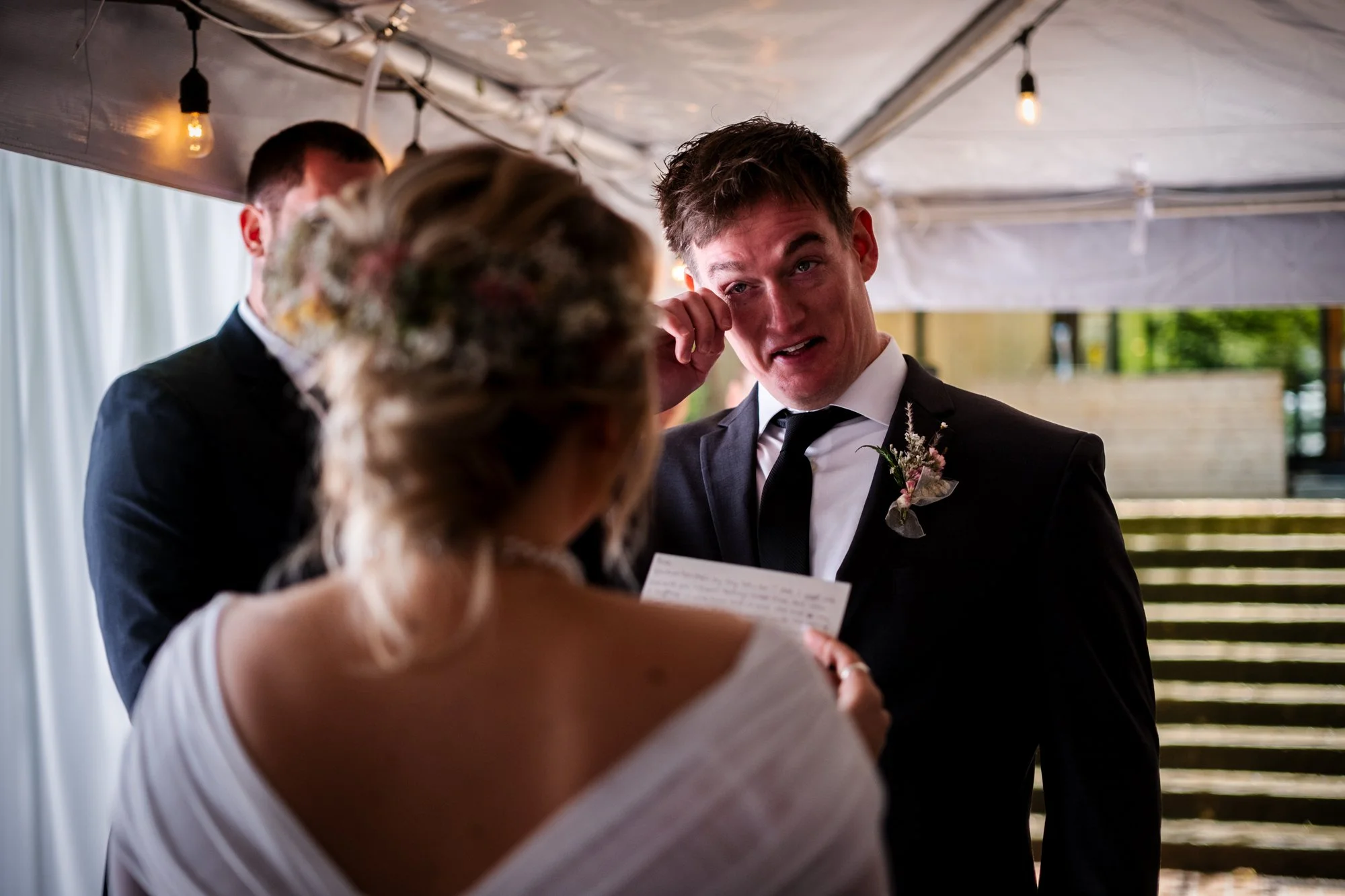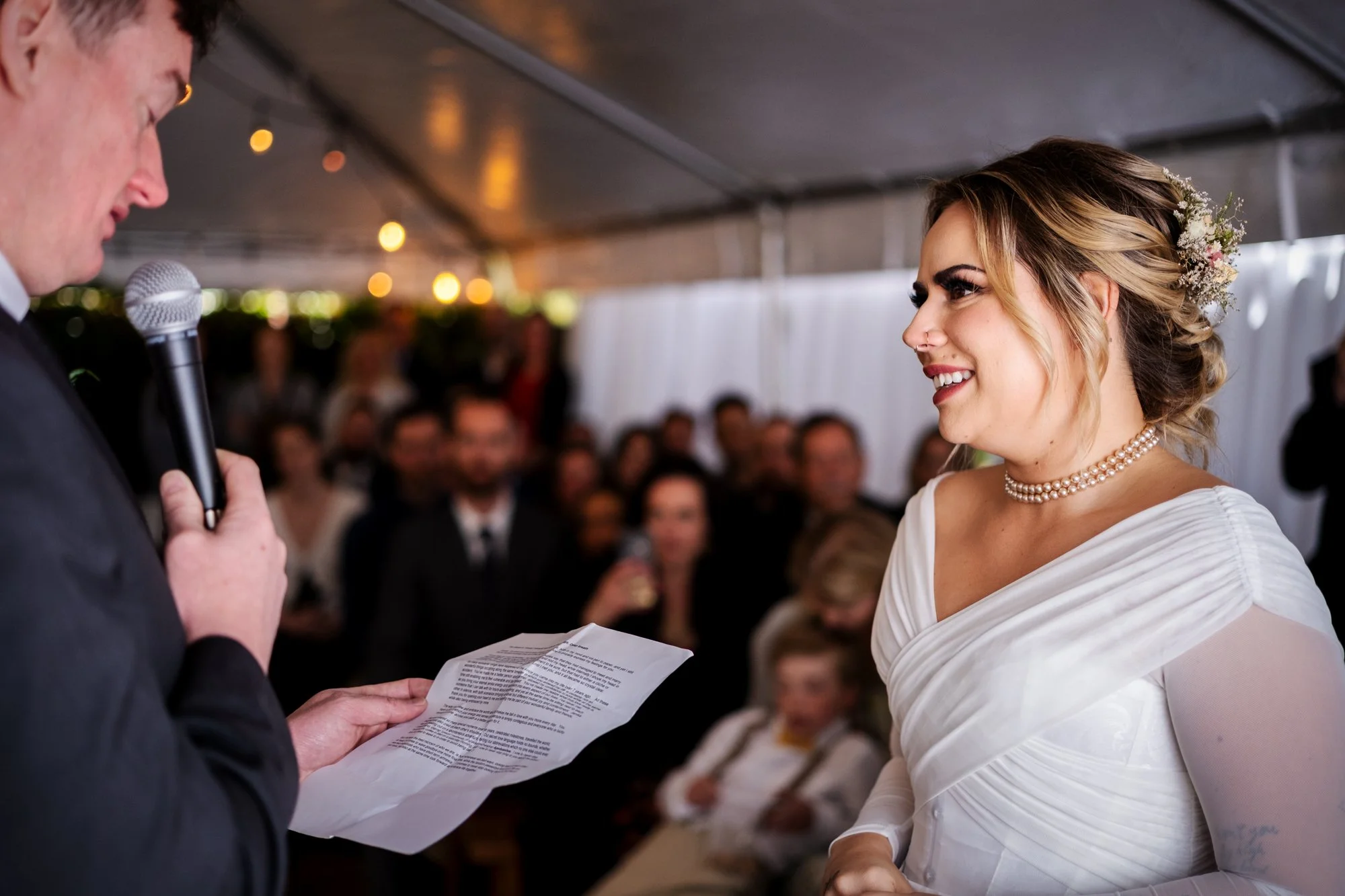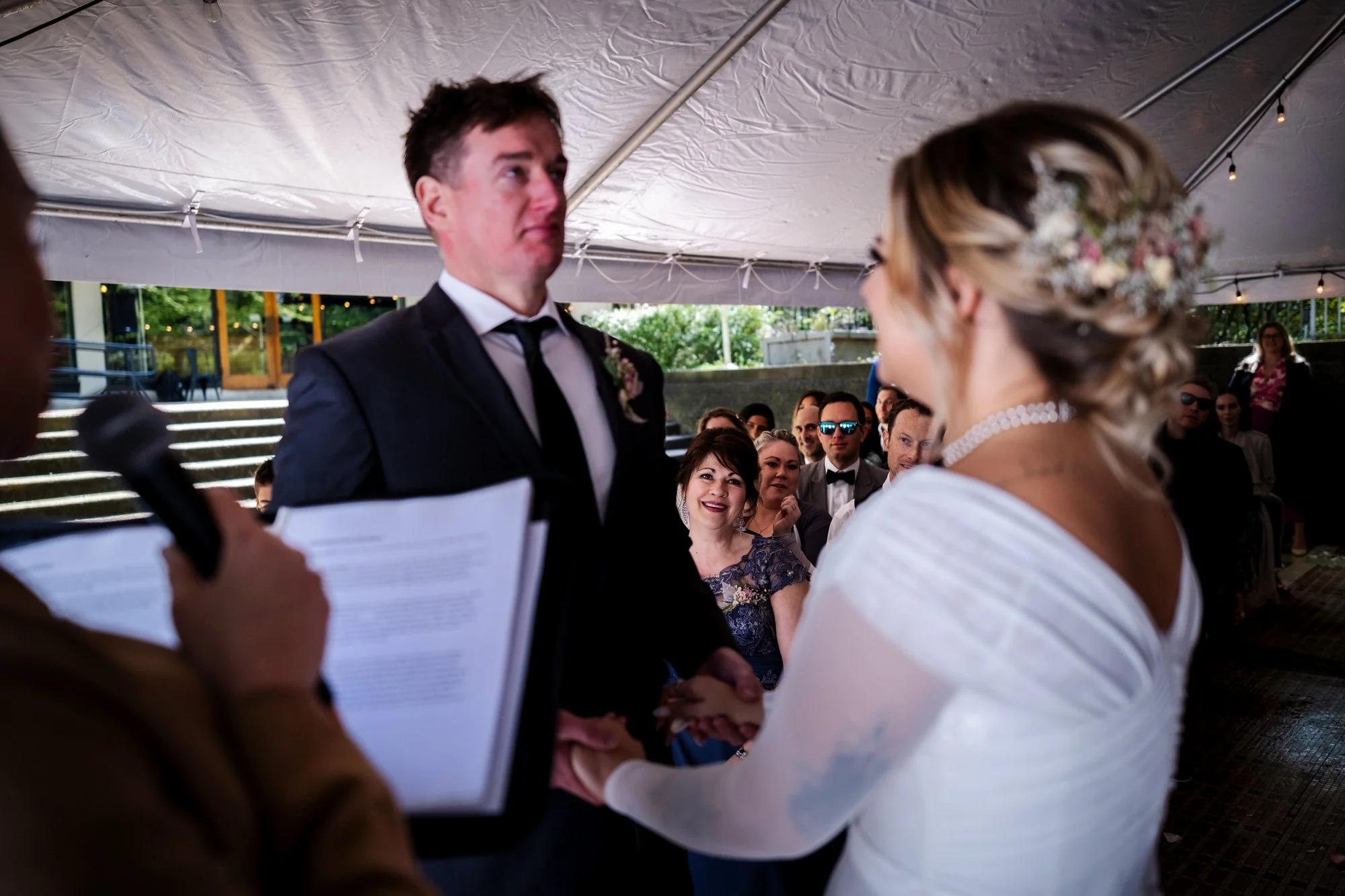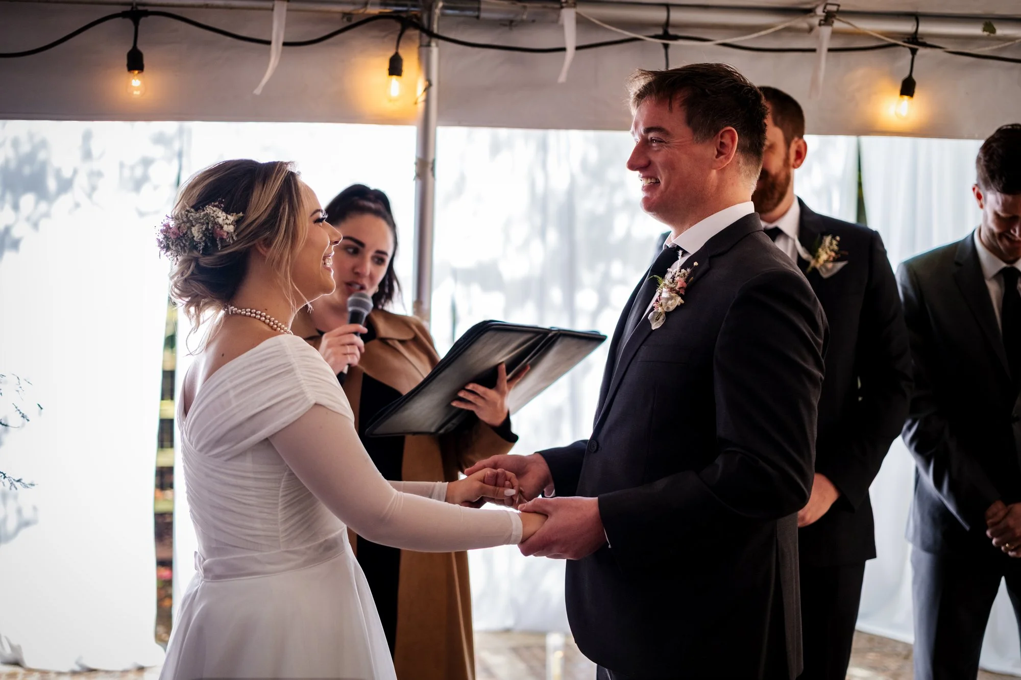 Getting Ready for the Ceremony As the couple prepared to say their vows, emotions ran high. In a cozy tent, Brad and Jenika shared a quiet moment together, surrounded by their closest friends and family. The officiant, microphone in hand, stood ready to guide them through their heartfelt vows. I focused on capturing not only Brad and Jenika’s expressions but also the emotions of their parents and guests, ensuring every meaningful glance and joyful tear was preserved.