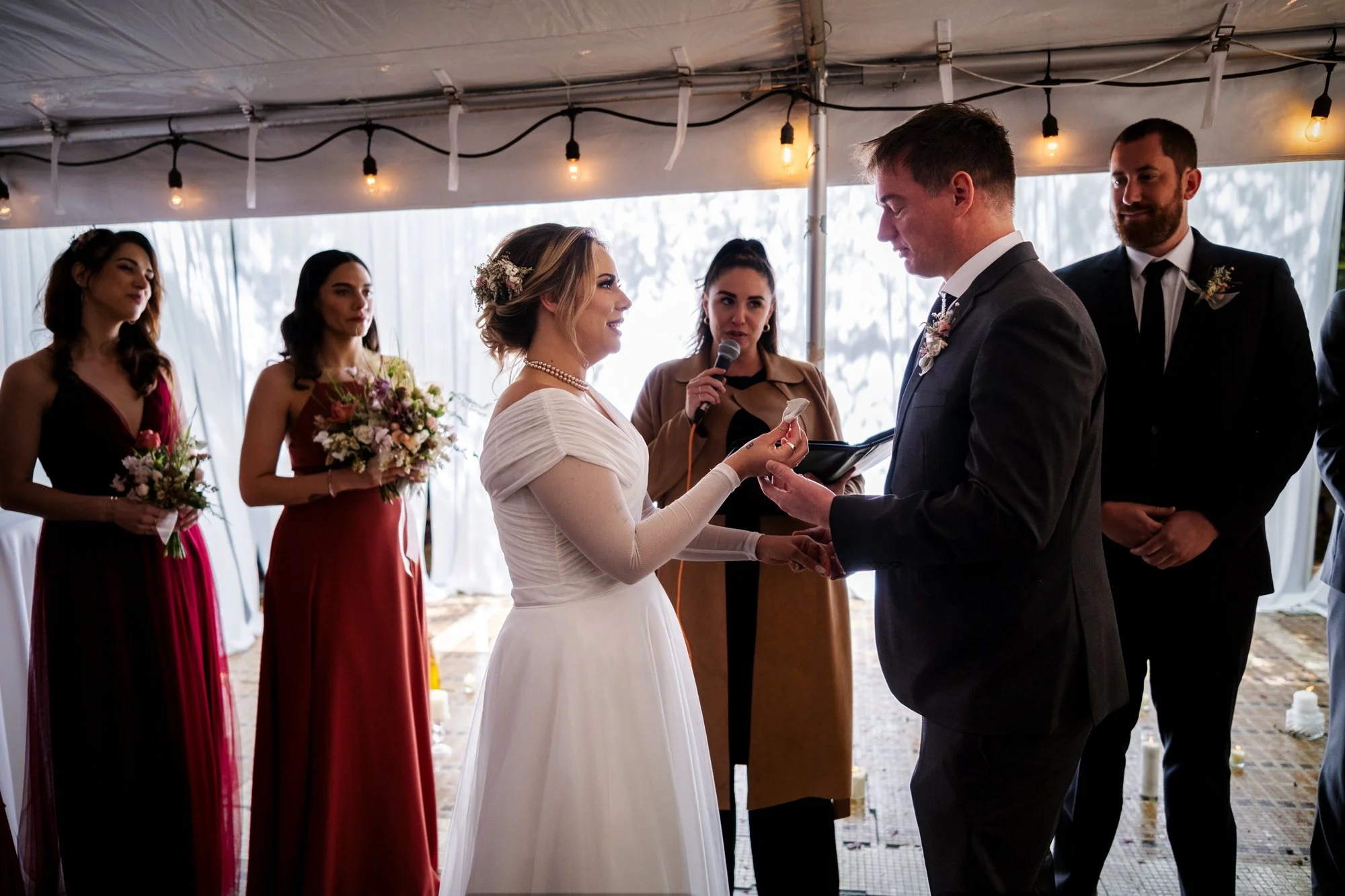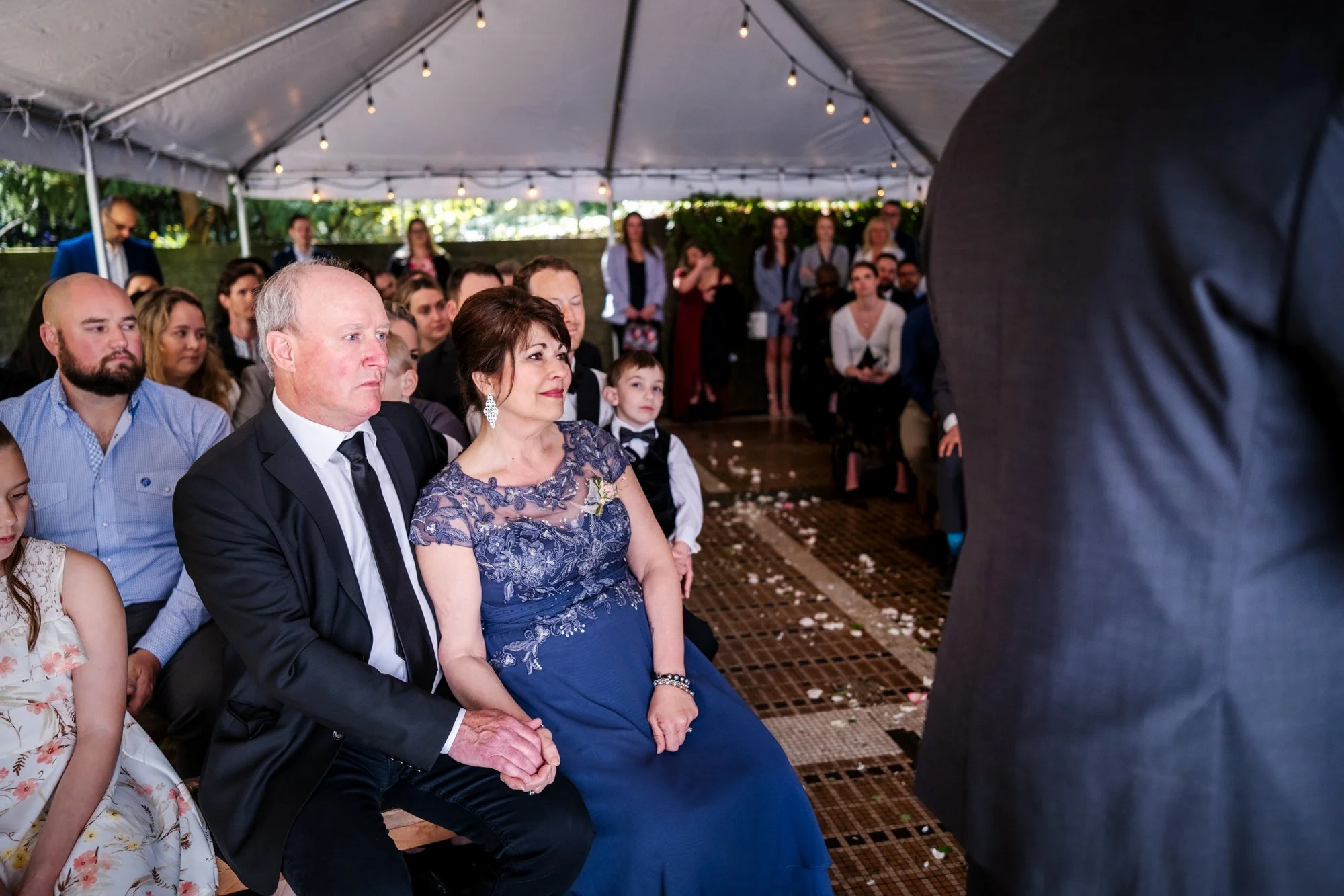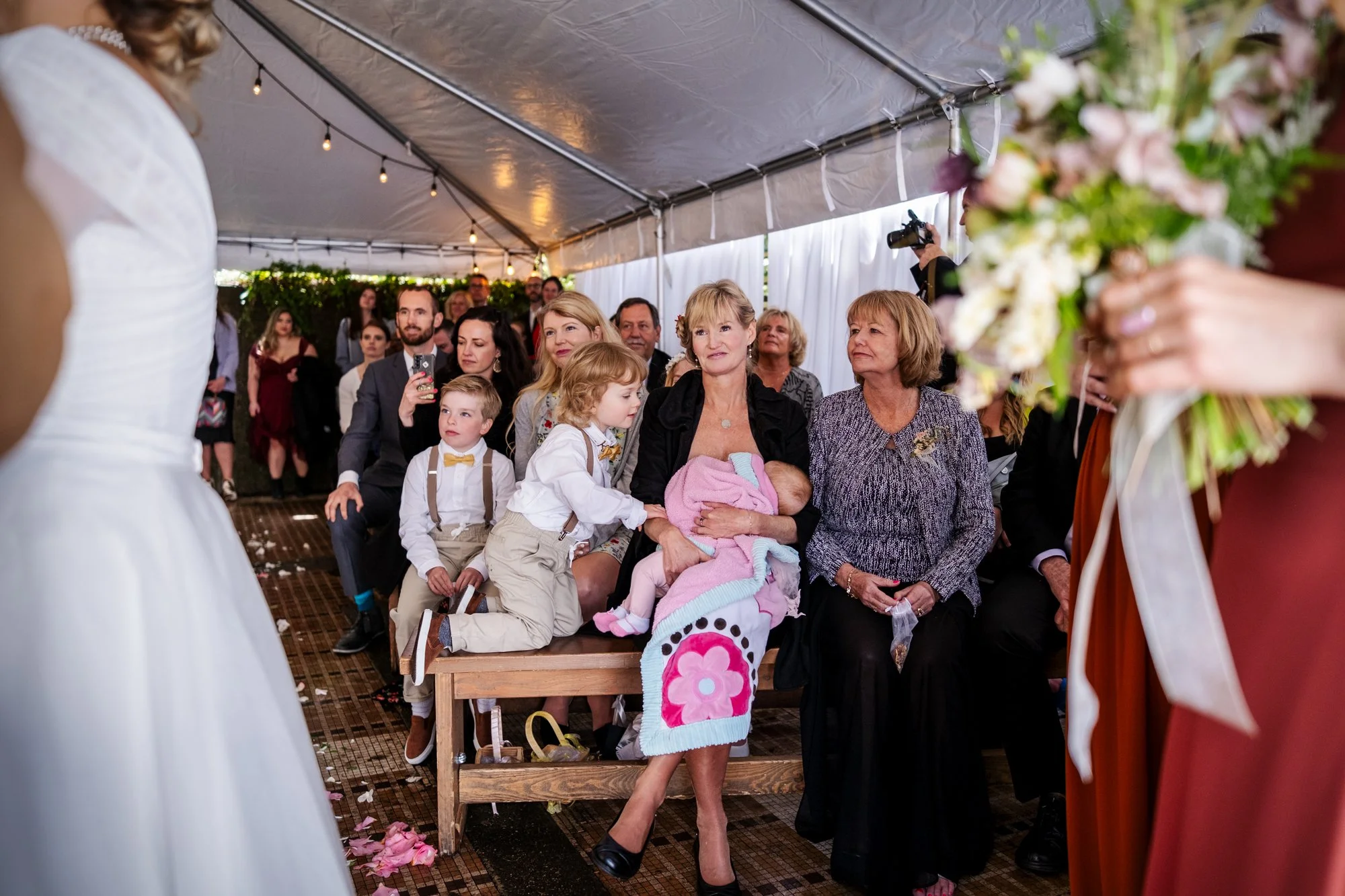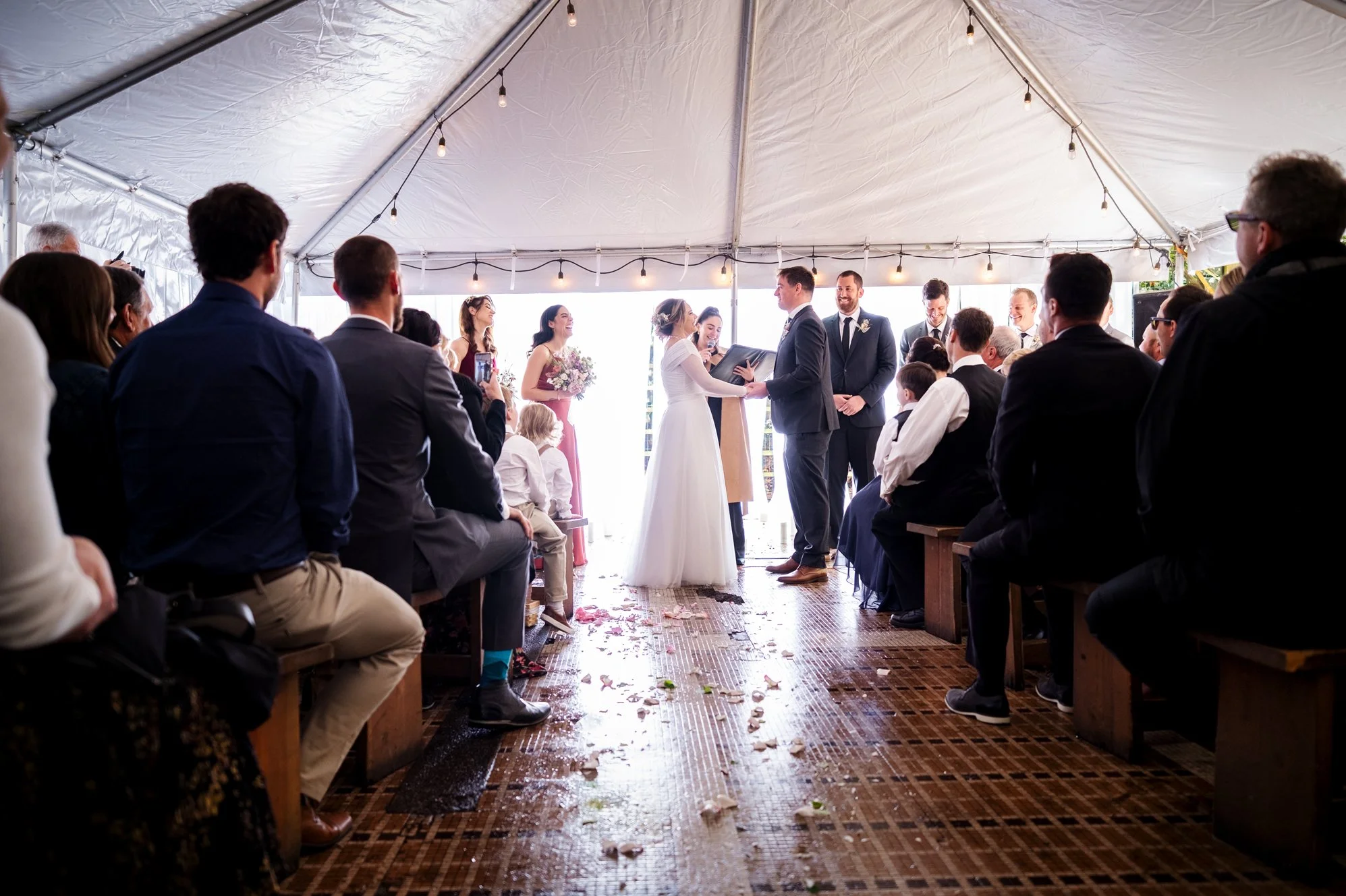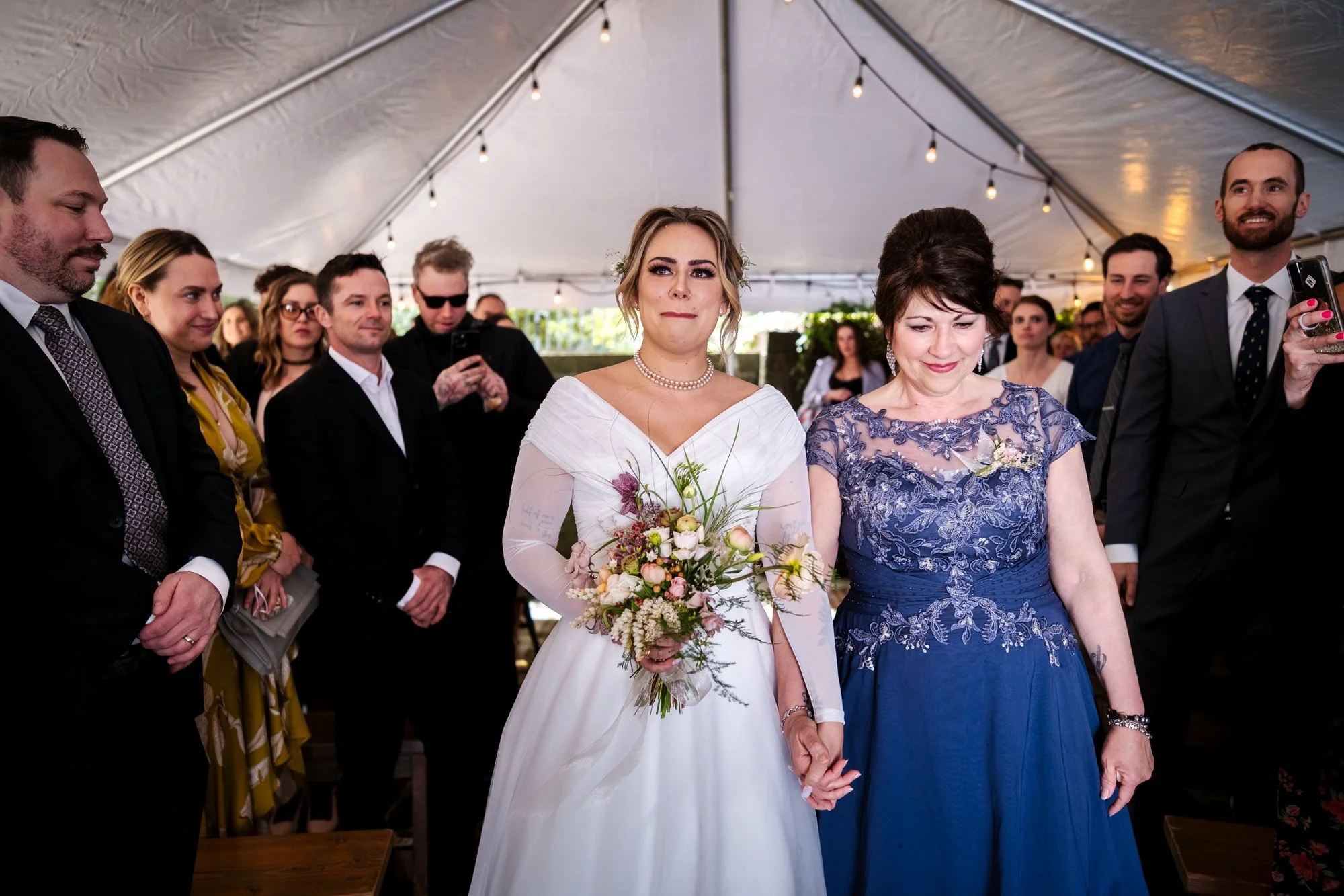 Getting Ready for the Ceremony As the couple prepared to say their vows, emotions ran high. In a cozy tent, Brad and Jenika shared a quiet moment together, surrounded by their closest friends and family. The officiant, microphone in hand, stood ready to guide them through their heartfelt vows. I focused on capturing not only Brad and Jenika’s expressions but also the emotions of their parents and guests, ensuring every meaningful glance and joyful tear was preserved.